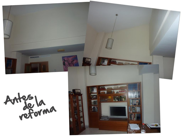 Al comunicar la habitación superior, donde se ha creado un acogedor estudio, con el salón comedor hemos pretendido unificar ambas estancias. El método empleado para este fin ha sido revestir la gran pared con los azulejos con aspecto de caravista que ya os mostramos en su momento.